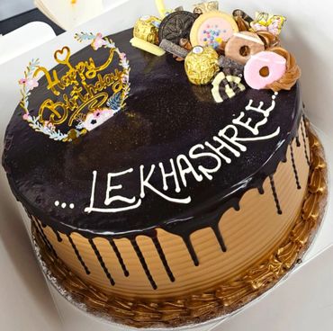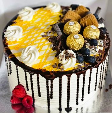 We can create a wonderful tower/regular size cake with a drip pattern and delicious chocolate decorations.
